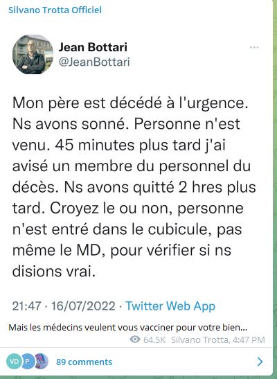 MecDeLaTerre 🌍❤️ @FuckLaCinqG · 18h En Italie un vieil homme apprend les effets néfastes du #vaccin 2h après s’être fait vacciner et retourne à l’hôpital pour en découdre..