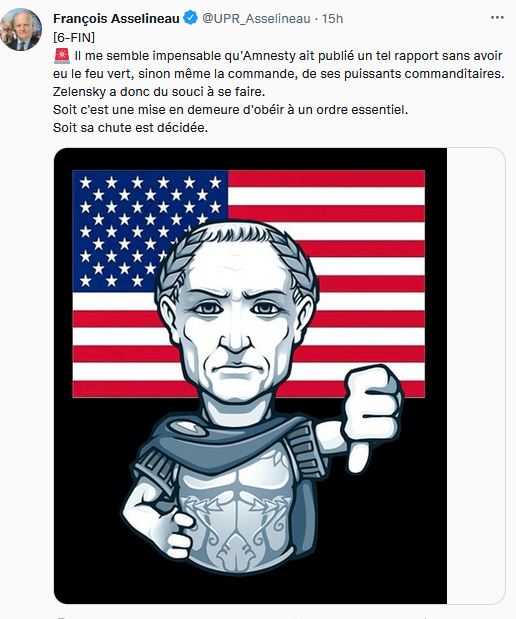 D'ailleurs, Zelensky est choqué de voir qu'une organisation occidentale s'autorise à le critiquer, lui saint Volodymyr, et sa réaction est toujours un grand moment de gaminerie puérile : il déclare en effet qu'Amnesty international, par ce rapport accablant contre lui et son administration, tente, je cite, «d'amnistier l'État terroriste de Russie», rien que ça !