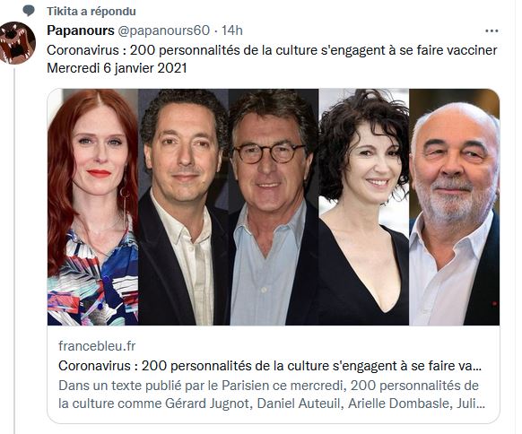 Rien ne change on pique les politiques, les acteurs , les notables avec des injections salines placéesbo,les seringues sont vides ! Certains ne savaient pas que cette piqûre était toujours sous essai clinique et que ça pouvait être hasardeux , ni les toubibs , ni certains acteurs, donc ils se pourraient piquer avec les zigues de notre espèce, Yves Régner en est mort .Que veux-vous les comédiens et acteurs une fois la quarantaine passée ont le stress du téléphone muet, aucun directeur, scénariste ou promoteur ne pense à untel pour tel rôle, alors ils signent n'importe quelle pétition ou répondent à n'importe quel appel dit d'utilité publique .