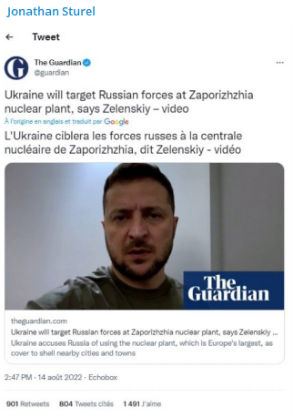 Mais combien de temps encore vont-ils décorer de couleurs Ukrainiennes, leur profil? Car par les temps qui courent, cela commence à faire tache! Pendant plusieurs jours, la presse mainstream a fait croire que les Russes tiraient des obus sur leur propre centrale de Zaporijia, mais c’était tellement débile que ce narratif ubuesque a dû être remplacé au plus vite. Maintenant Zelensky revendique les tirs ukrainiens! Pourquoi? les Russes abritent leur artillerie… dans la centrale! (remarquez que cette information n’est pas vérifiée!) Oh, les vilains qui défendent leur position! Les journalistes respirent, ils ont quand même un article anti-russe à se mettre sous la dent…sauf que celui qui réfléchit une seconde comprend que les Ukrainiens bombardent une centrale nucléaire au risque de provoquer une catastrophe atomique sans précédent… Et la raison? Les autorités russes ont déclaré que l’électricité de cette centrale n’irait qu’à la partie qu’elles contrôlent; de fait, l’Ukraine risquerait donc de se trouver en pénurie d’électricité et ne pourrait pas l’exporter comme prévue vers l’Europe! Alors Zelensky fait du chantage à la catastrophe nucléaire!
