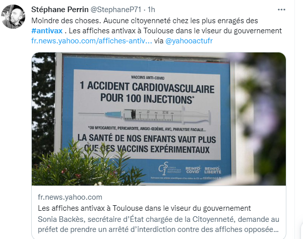 Pourtant, aujourd’hui ces petites crapules qui ont été en pointe dans la propagande, les fausses rumeurs, la désinformation médicale la plus stupide, enlèvent le masque de leur profil twitter, ils ont fait également disparaître le nombre de seringue de leur vaccination… Alors les ânes médecins, le vaccin n’est-il plus magique? Vous cachez-vous depuis que les vrais médecins ont révélé que ce truc ne protège ni de la transmission ni de l ‘infection, et que les vaccinés meurent du covid? Quant aux effets secondaires, on en parle? Un vrai boomerang, ce réel! Mais on remarquera que certains arborent encore, comme tous les petits soldats de Macron, le drapeau Ukrainien!