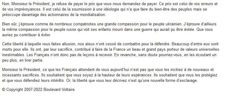 Beaucoup de ces célébrités du petit écran se disent journalistes, ils ont même une carte de journaliste, alors qu'ils n'ont fait toute leur vie que nous raconter des salades, des bobards, hé oui ! Ils n'étaient pas au service de l'État, ni du président mais des banquiers centraux et oligarques régissant ce monde. Ils ont fait semblant d'être de grands libéraux à l'esprit ouvert servant l'information, qu'ils aillent tous se coucher ! Ils ont l'âge de se faire oublier pour tout le poison qu'ils ont distillé à petites doses chaque jour .