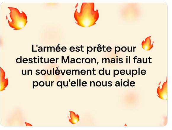 Bruno Honore Enfin !!nous sommes prêt !!!! ELU avec 20 % du corps électoral contre 80% d'opposants a sa politique voila ce que représente E Macron n'ayez pas de crainte les Français n'ont pas voté pour lui ils ont voté contre M le Pen personne n'a validé son programme et ses mesures ,il va nous conduire a notre perte il doit être renversé l'armée du peuple doit prendre le pouvoir !!!!