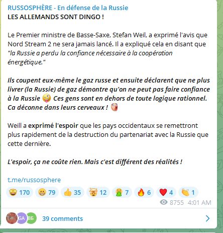 - Nord stream 2 : Gazprom attend des poèces de siemens pour le faire tourner, mais Siemens ne livre pas , cause : embargo !