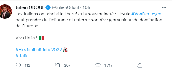 Cela se traduit par la submersion migratoire, l’islamisation de nos pays, les clandestins imposés à nos campagnes, la terreur sanitaire, l’imposture climatique, la soumission à l’Union européenne et la guerre menée à la Russie, en surarmant l’Ukfraine. Et pendant ce temps-là, la prétendue aile dure de la droite jure de ne jamais faire alliance avec ce qu’ils appellent l’extrême droite, tandis qu’en Italie, c’est cette alliance qui va faire gagner Giorgia Meloni, Matteo Salvini et Silvio Berlusconi