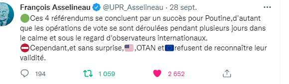 Je ne me suis jamais positionné pour un camp contre un autre dans cette guerre russo-ukrainienne. Je ne suis ni pro-russe ni pro-ukrainien et suis capable d'entendre les arguments des deux camps, d'être politiquement d'accord avec les uns contre les autres y compris lorsque moralement cet accord est très difficile à donner. Le fait d'être dépassionné sur cette question rend évidemment plus lucide, plus pragmatique. Quand je vois les pro-ukrainiens devenir complètement dingues sur Twitter et dans les médias, et les pro-russes ne pas l'être moins, je mesure ma chance de n'avoir pas été aspiré par la tentation émotionnelle. Il y a une chose cependant qui est évidente, qui crève les yeux lorsqu'on regarde cet événement avec des yeux dépassionnés : c'est que le camp pro-ukrainien est plein de gens franchement malsains en France et en Europe. Quand je vois des droitards qui se prenaient il n'y a pas si longtemps pour des patriotes, chanter aujourd'hui dans la même chorale que BHL, Macron, Enthoven, Ursula, Ménard, Biden, Libé et toutes sortes d'autres monstres de cette nature, j'ai quand même un peu de pitié pour eux. Des camps se déchirent, des esprits deviennent fous, des colères abolissent des fraternités exactement comme au temps où c'est le conflit israélo-palestinien qu'on nous imposait dans les médias. Je m'en tiens à un principe : lorsque je vois BHL, Macron, Enthoven, Ursula, Ménard sur une barricade, mon instinct me crie de prendre la barricade d'en face. Comme Français, je n'ai aucun combat commun à mener avec des gens qui organisent la destruction de mon pays. Il y a des alliances de circonstances qui vous disqualifient à vie.