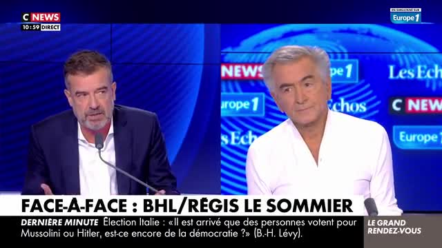 BHL nous explique donc que la démocratie, c’est seulement quand les électeurs votent pour ses idées. Et donc que quand ces mêmes citoyens votent pour quelqu’un qui ne défend pas ses valeurs, ils ne sont pas respectables. «Non, il ne faut pas toujours respecter les électeurs. Vous savez, quand les électeurs portent au pouvoir Benito Mussolini, ou Adolf Hitler, ou même Vladimir Poutine, ce choix n’est pas respectable. La démocratie, c’est deux choses : c’est la volonté populaire bien sûr, mais c’est aussi le respect d’un certain nombre de valeurs et de principes fondamentaux qui caractérisent aussi la démocratie».
