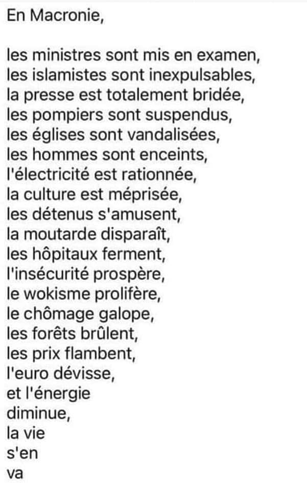 Beaucoup pensent que Macron ne finira pas l'année .C'est vrai qu'il n'a rien foutu depuis 5 ans et il a emmerdé les français. Chaque mauvais coup que nous avons reçu, il était derrière. Regardez le Covid et les vaxx, il a imposé un vaxx qui s'avère être aujourd'hui inefficace contre le virus et dangereux pour la santé d'une minorité d'injectés. Comme Trudeau, il a foncé comme un bulldozer et obéit à l'oligarchie. Aujourd'hui face à toutes ces erreurs ses maîtres s'effacent sur la pointe des pieds et il reste seul face au mal qu'il a infligé à un peuple, il peut avoir toute la richesse du monde, elle n'égalera jamais la solitude qu'il va trouver maintenant. Et pour éviter les regards de mépris qu'il va subir il devra s'expatrier très loin pour le restant de ses jours .