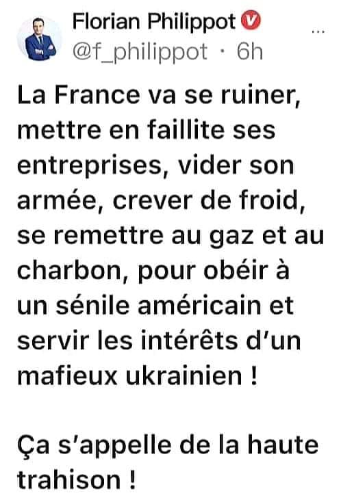Étonnant que Macron à cette facilité à trouver des milliards* pour l’Ukraine alors qu’on a un mal fou à financer nos hôpitaux…, et que les retraites et les salaires ne suivent pas l’augmentation le coût de l’inflation. Les Français ont-ils peur de Macron et/ou préfèrent-ils vivre dans le moment présent dans leur minable petit confort au lieu de penser à l’avenir de leurs enfants et petits-enfants. L’égoïsme à des limites ! J’appelle les Français à faire la guerre contre la politique de Macron avant qu'il ne finisse de ruiner et détruire la France et les Français. *P.S. : Il s’agit de fonds publics payés par les impôts de tous les Français