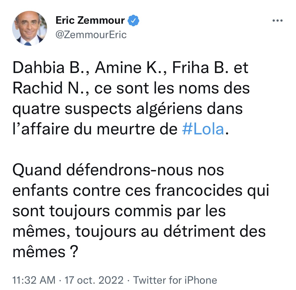 Lola est morte il y a à peine quatre jours et déjà, nombre d’entre vous ne parlent plus du comment ni du pourquoi de la tragédie qu’elle a vécue, que sa famille continuera à vivre jusqu’à la fin de ses jours et que tant de nos familles connaitront demain si l’on ne fait rien. Cela fait à peine quatre jours, et vous changez déjà de sujet. Lola n’est pas encore enterrée, et vous parlez déjà de stratégie politico- médiatique, « d’extrême-droite » et de récupération.