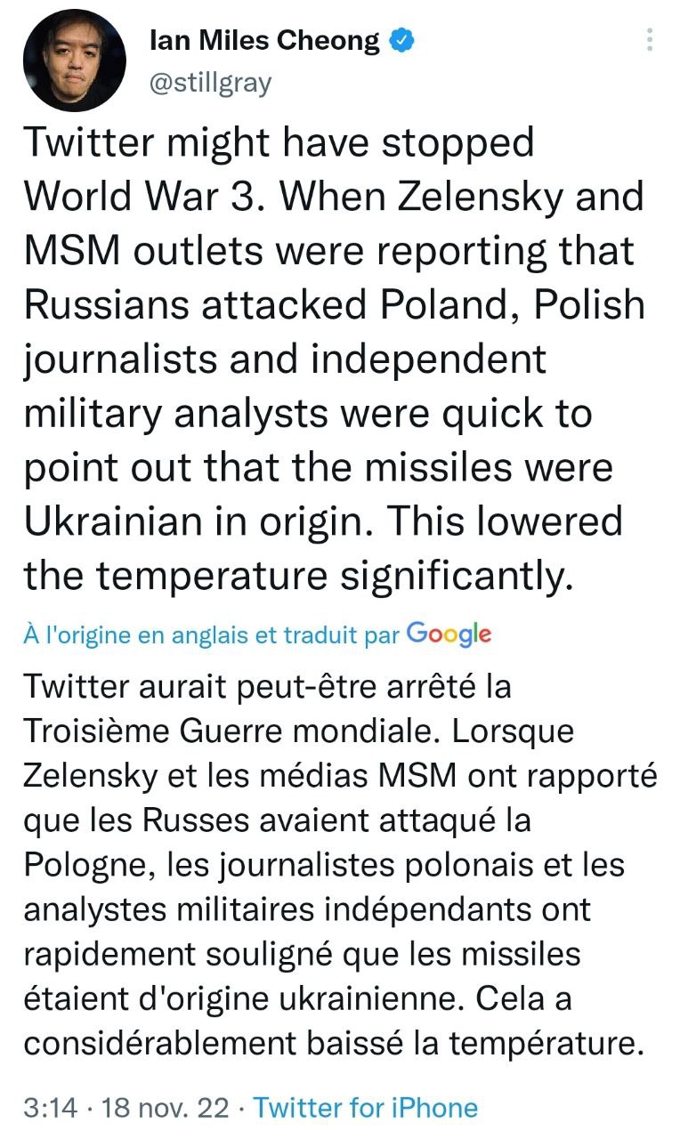 Les réseaux sociaux bien utilisés permettent de parasiter le récit que les médias veulent imposer en partenariat avec l'engeance politique au service de laquelle ils travaillent. Ici typiquement, c'est sur Internet que l'on a pu rapidement désamorcer le mensonge de Zelensky, mensonge que les médias, eux, ont tenté de faire monter toute la nuit.