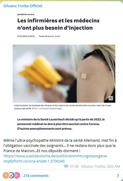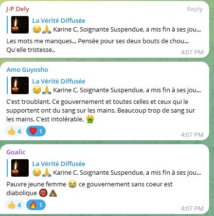 Je connais cette vaillante infirmière, je suis allée en manif avec elle. Gros respect à elle. En temps que patiente, je ne veux pas être prise en charge par des gens piquouzés, qui bossent en étant positifs