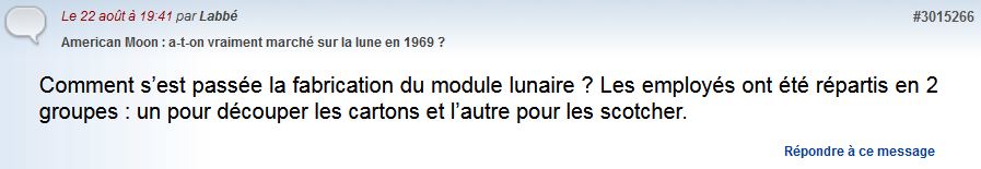 Réflexion faite, on a du mal à croire qu'en '69 on aurait envoyé 3 hommes sur la lune, imaginez ce qu'il y a dans votre P.C. prenait la place d'une pièce de 20 m2, à,cette époque on avait à peine commercialisé la calculatrice éléctronique : "En 1967, la société américaine Texas Instruments crée un premier prototype et en dépose le brevet. En janvier 1971, la première véritable calculatrice de poche et électronique, avec un écran DEL est la LE-120A de Busicom." Le P.C. familial est commercialisé 20 ans plus tard . Et puis depuis qu'on aurait marché sur la lune, rien après, on a abandonné toutes les autres missions sur la lune et ailleurs , pourquoi ? Parce qu'on ne sait pas encore faire .