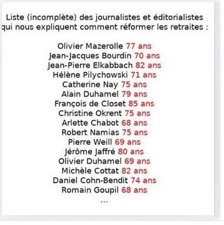 Beaucoup de ces célébrités du petit écran se disent journalistes, ils ont même une carte de journaliste, alors qu'ils n'ont fait toute leur vie que nous raconter des salades, des bobards, hé oui ! Ils n'étaient pas au service de l'État, ni du président mais des banquiers centraux et oligarques régissant ce monde. Ils ont fait semblant d'être de grands libéraux à l'esprit ouvert servant l'information, qu'ils aillent tous se coucher ! Ils ont l'âge de se faire oublier pour tout le poison qu'ils ont distillé à petites doses chaque jour .